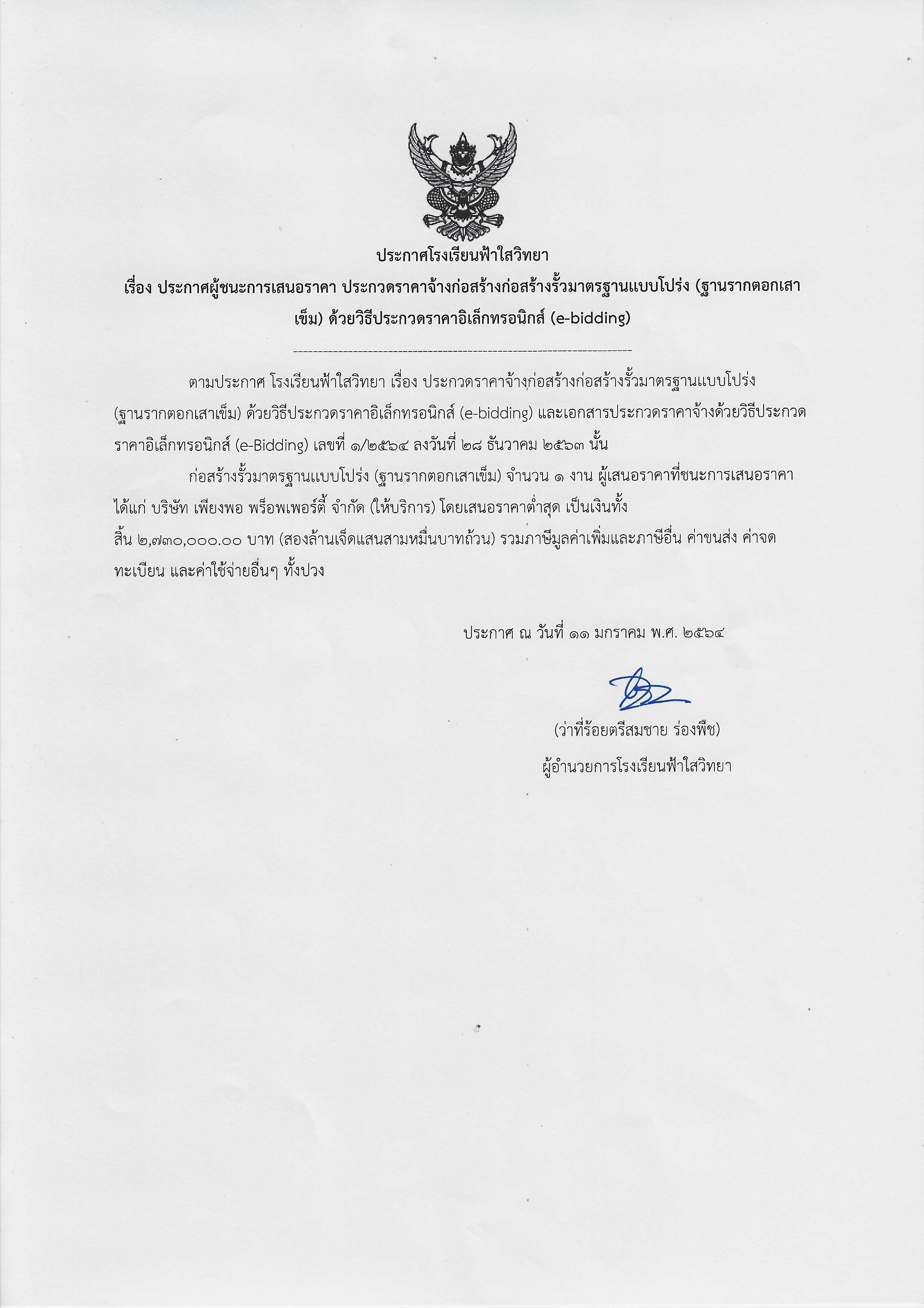 ประกาศโรงเรียนฟ้าใสวิทยา ลงวันที่ 11 มกราคม พ.ศ.2564 เรื่อง ประผู้ชนะการเสนอราคา ก่อสร้างรั้วแบบมาตรฐานแบบโปร่ง