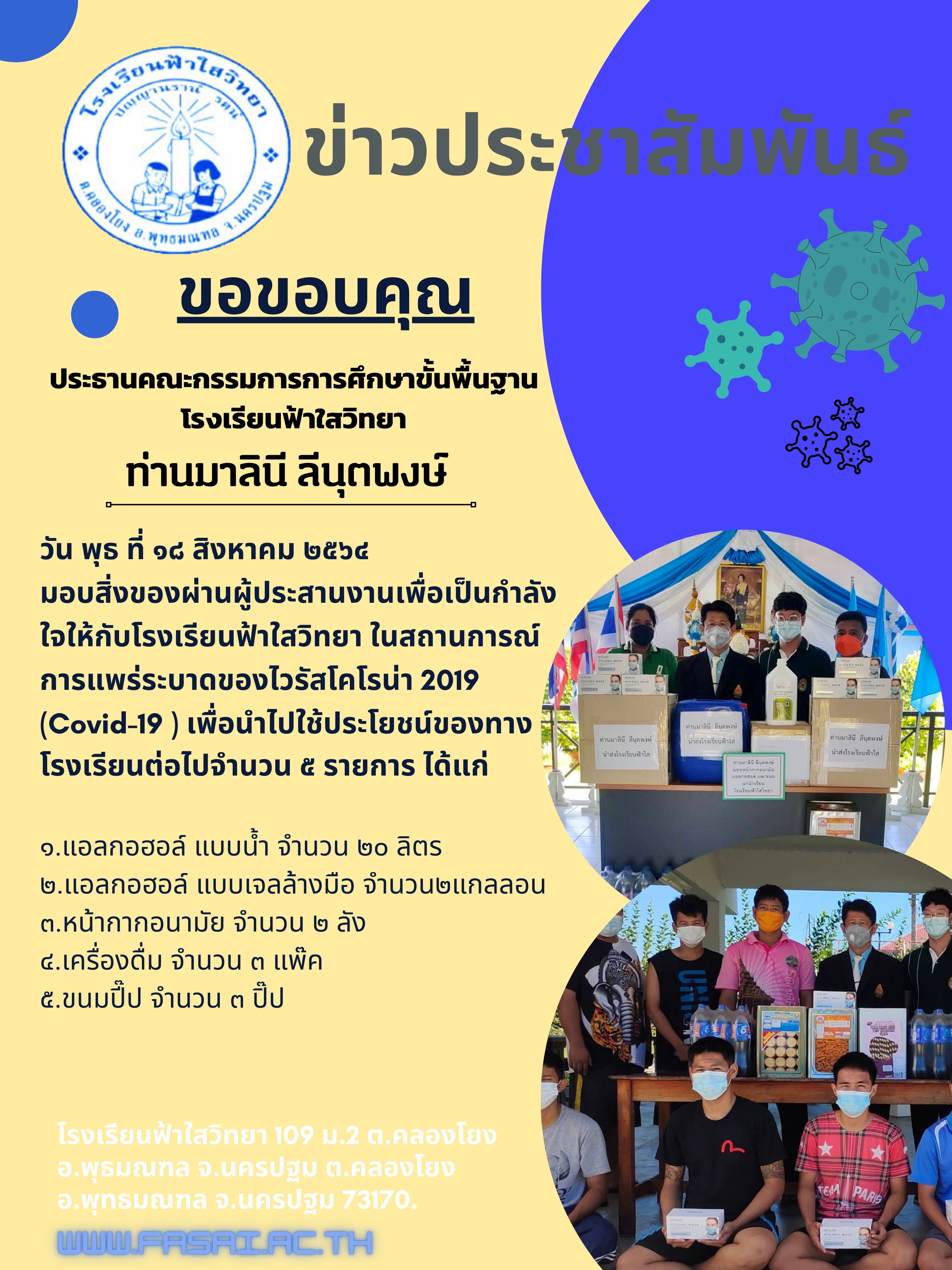 วัน พุธ ที่ ๑๘ สิงหาคม ๒๕๖๔ ท่านมาลินี ลีนุตพงษ์ ประธานคณะกรรมการการศึกษาขั้นพื้นฐานโรงเรียนฟ้าใสวิทยา มอบสิ่งของผ่านผู้ประสานงานเพื่อเป็นกำลังใจให้กับโรงเรียนฟ้าใสวิทยา ในสถานการณ์การแพร่ระบาดของไวรั