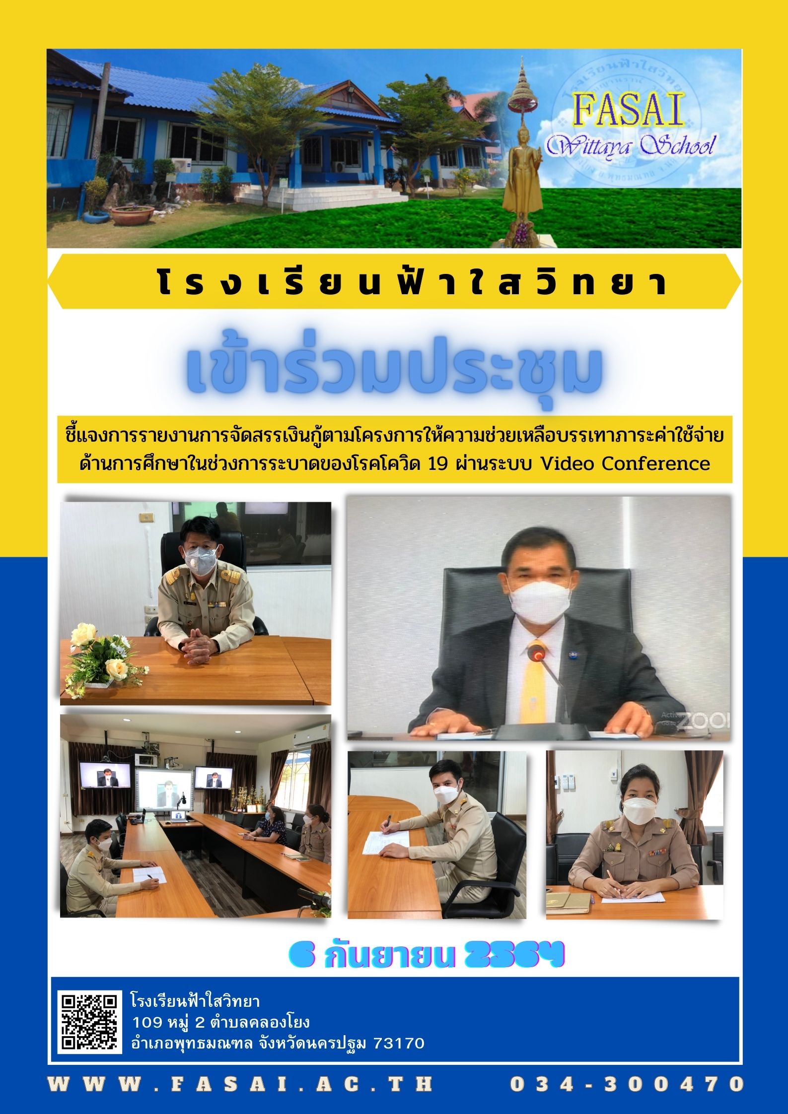 ผู้อำนวยการว่าที่ร้อยตรีสมชาย ร่องพืช และคณะครูโรงเรียนฟ้าใสวิทยาเข้าร่วมชี้แจงการรายงานการจัดสรรเงินกู้ตามโครงการให้ความช่วยเหลือบรรเทาภาระค่าใช้จ่ายด้านการศึกษาในช่วงการระบาดของโรคโควิด 19 ผ่านระบบ Video Conference ในวันที่ 6 กันยายน พ.ศ.2564