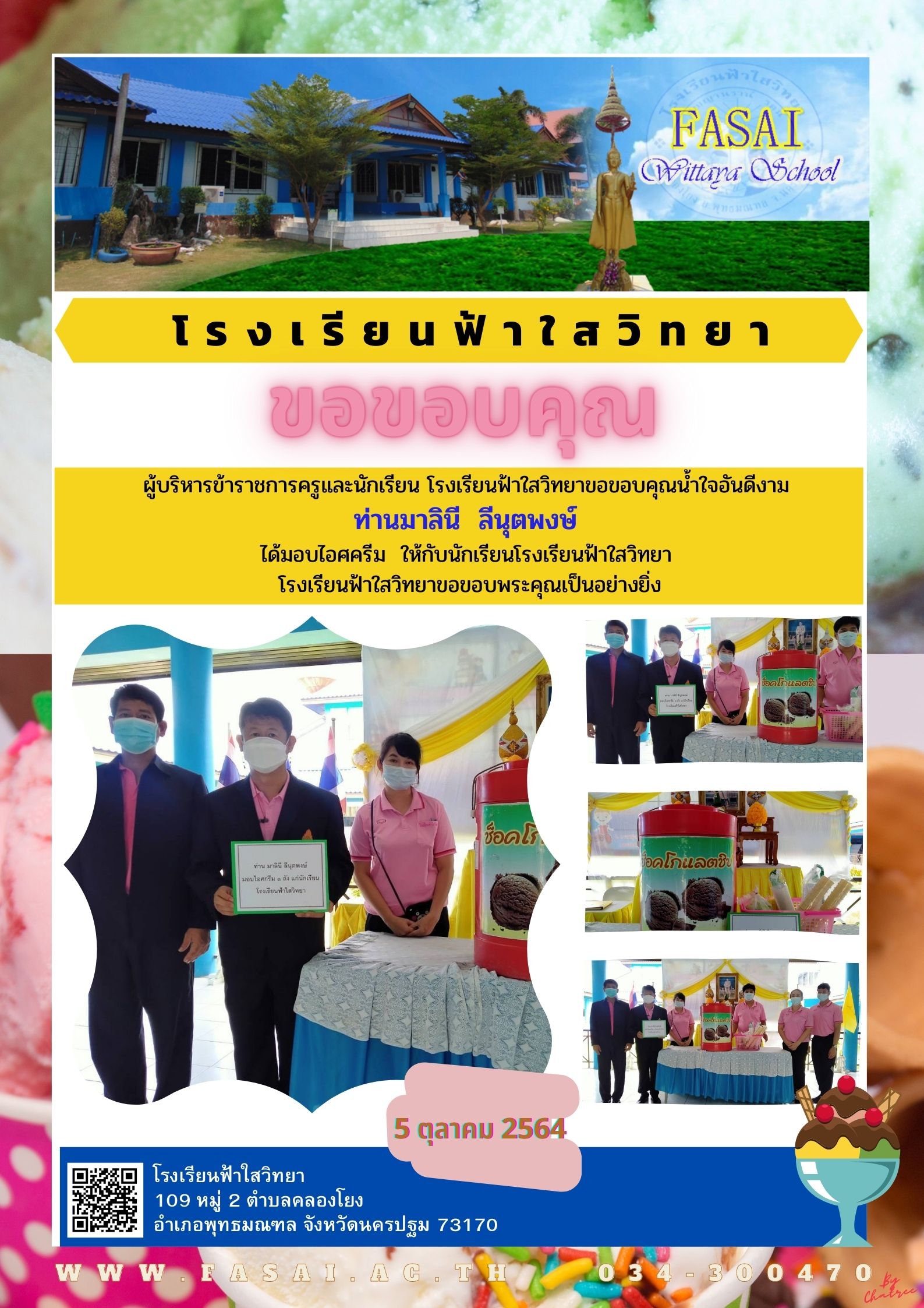 ในวันที่ 5 ตุลาคม 2564 ท่านผู้อำนวยการว่าที่ร้อยตรีสมชาย ร่องพืช ท่านรองผู้อำนวยการว่าที่ร้อยตรีเอกราช เผ่าเมือง ข้าราชการครูและนักเรียน โรงเรียนฟ้าใสวิทยาขอขอบคุณ ท่านมาลินี ลีนุตพงษ์