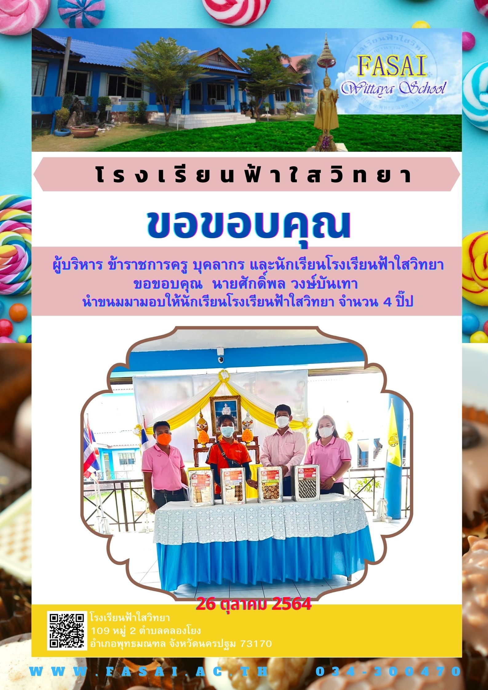 บริหาร ข้าราชการครู บุคลากร และนักเรียนโรงเรียนฟ้าใสวิทยา ขอขอบคุณ นายศักดิ์พล วงษ์บันเทา นำขนมมามอบให้นักเรียนโรงเรียนฟ้าใสวิทยา จำนวน 4 ปิ๊ป