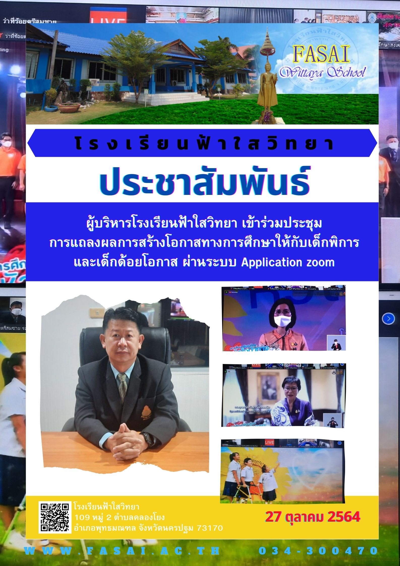 ในวันที่ 27 ตุลาคม 2564 ท่านผู้บริหารโรงเรียนฟ้าใสวิทยา เข้าร่วมประชุม การแถลงผลการสร้างโอกาสทางการศึกษาให้กับเด็กพิการและเด็กด้อยโอกาส ผ่านระบบ Application zoom