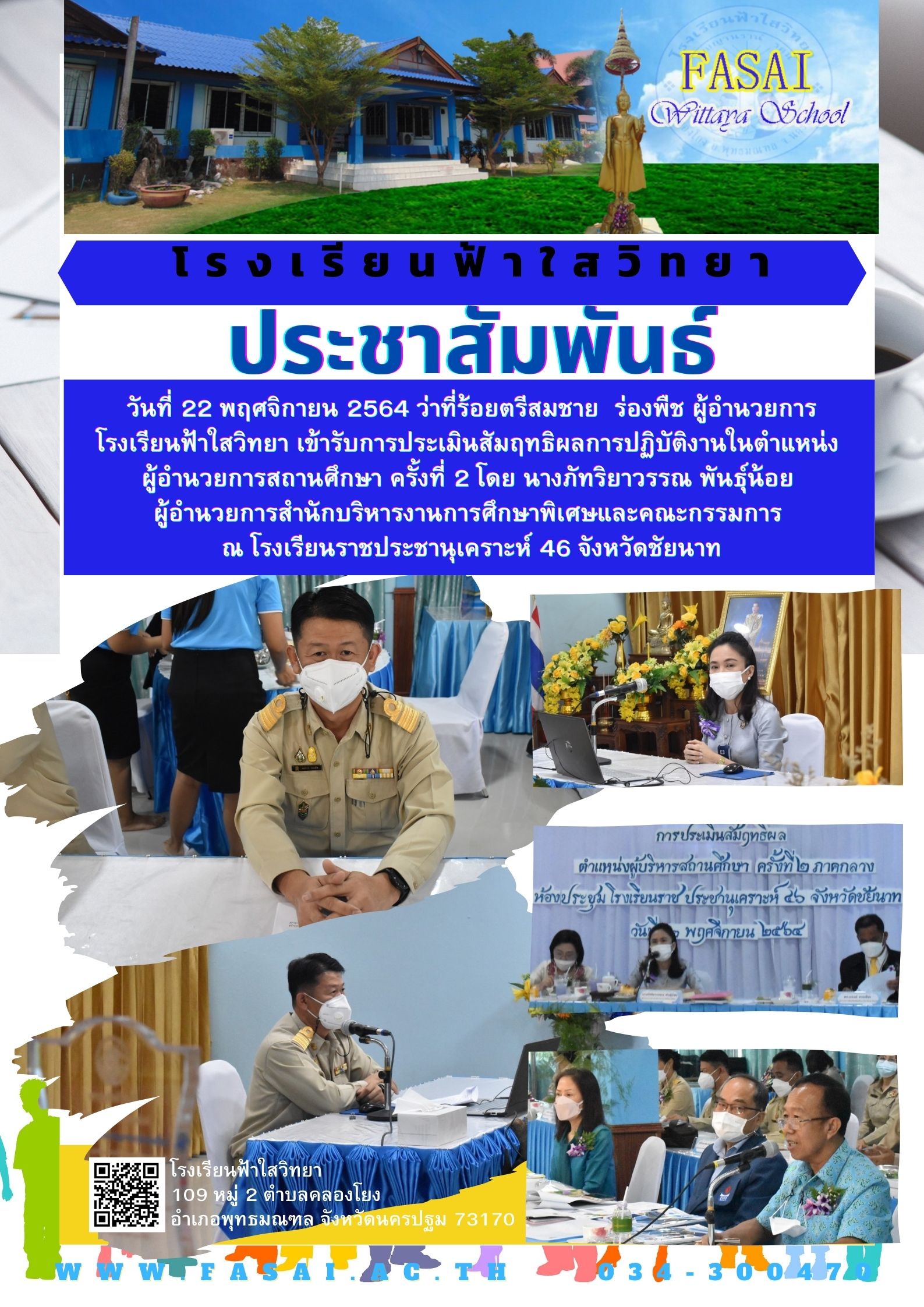 วันที่ 22 พฤศจิกายน 2564 ว่าที่ร้อยตรีสมชาย ร่องพืช ผู้อำนวยการ โรงเรียนฟ้าใสวิทยา เข้ารับการประเมินสัมฤทธิผลการปฏิบัติงานในตำแหน่ง ผู้อำนวยการสถานศึกษา ครั้งที่ 2 โดย นางภัทริยาวรรณ พันธุ์น้อย ผู้