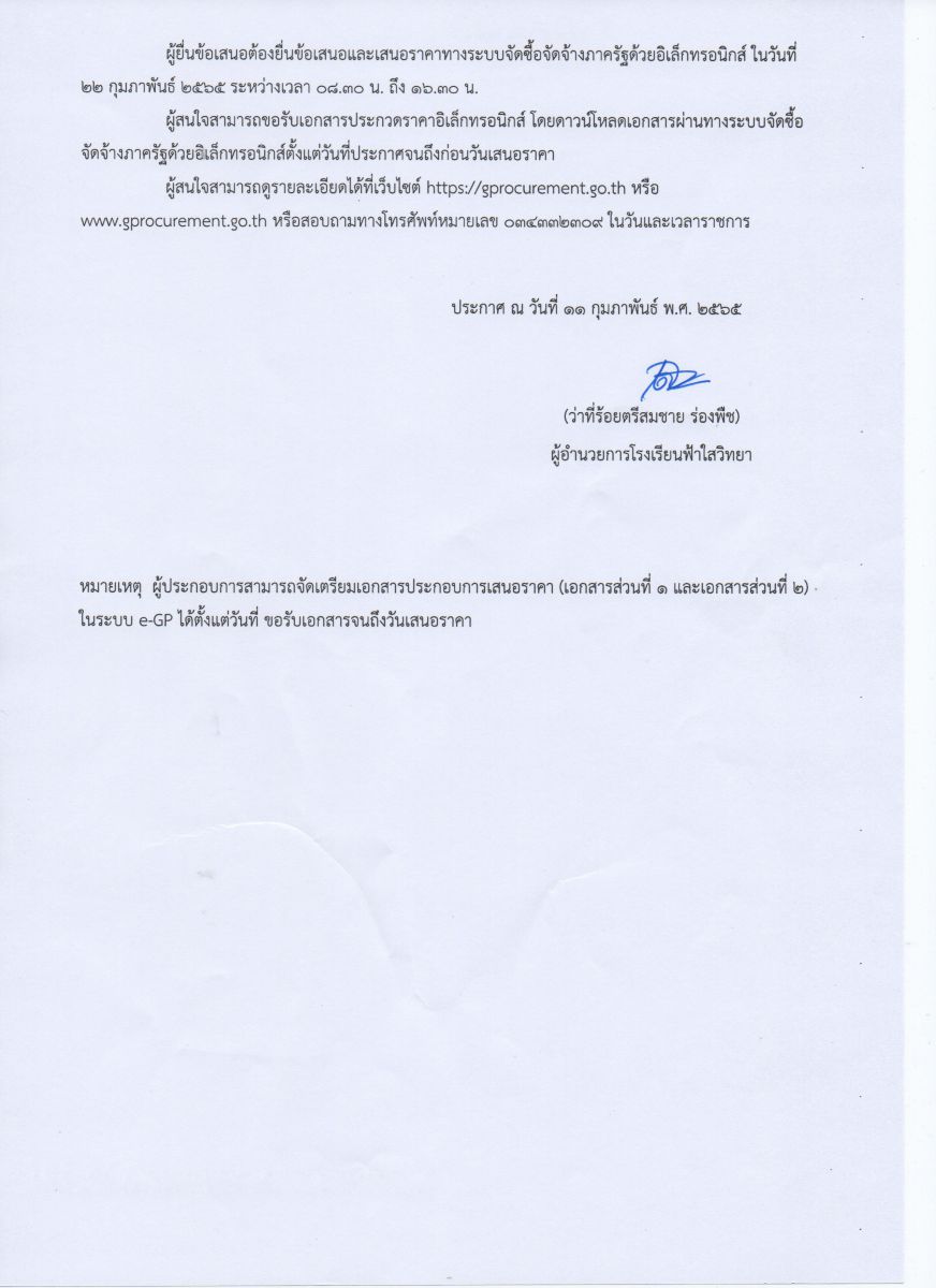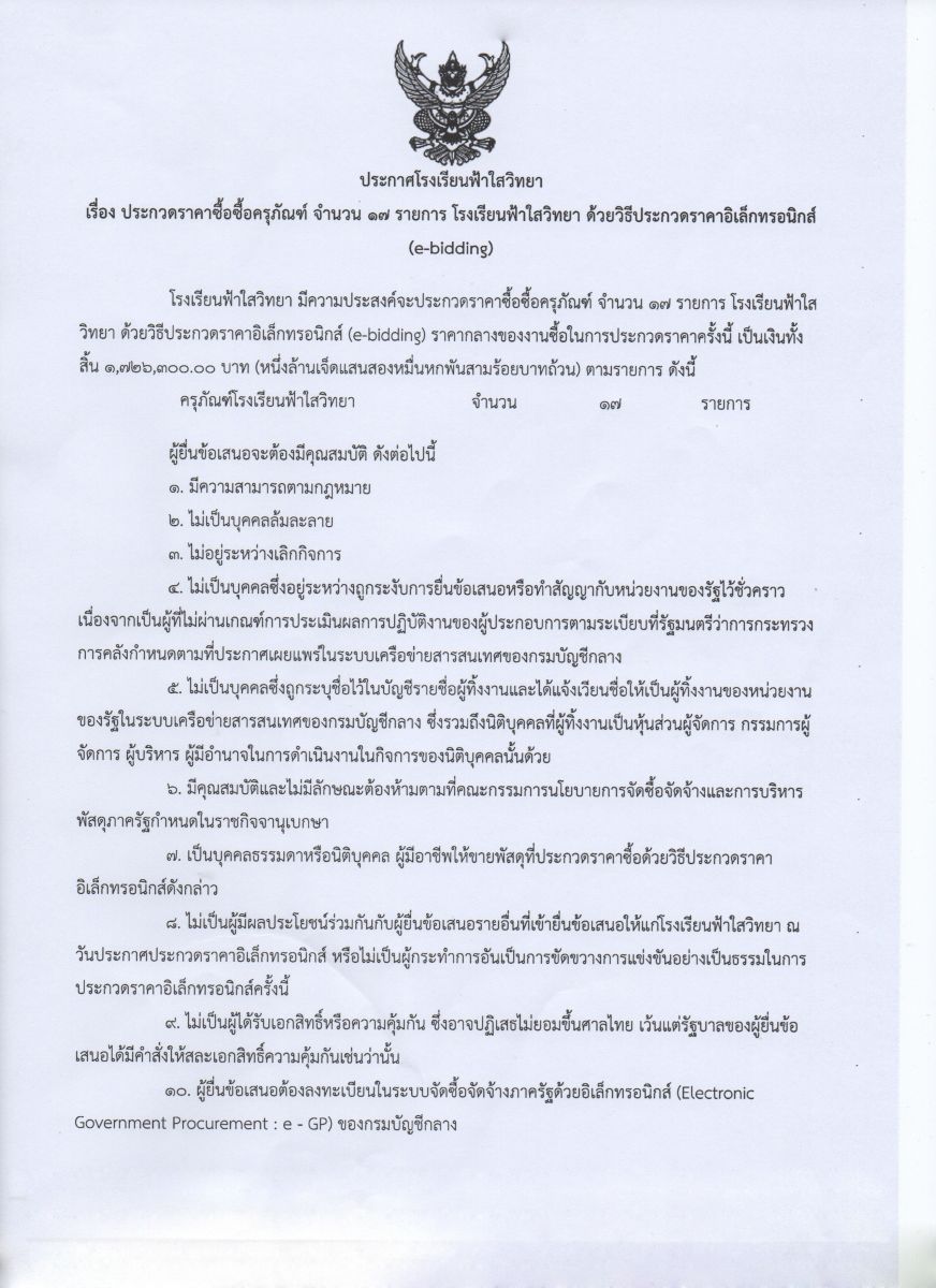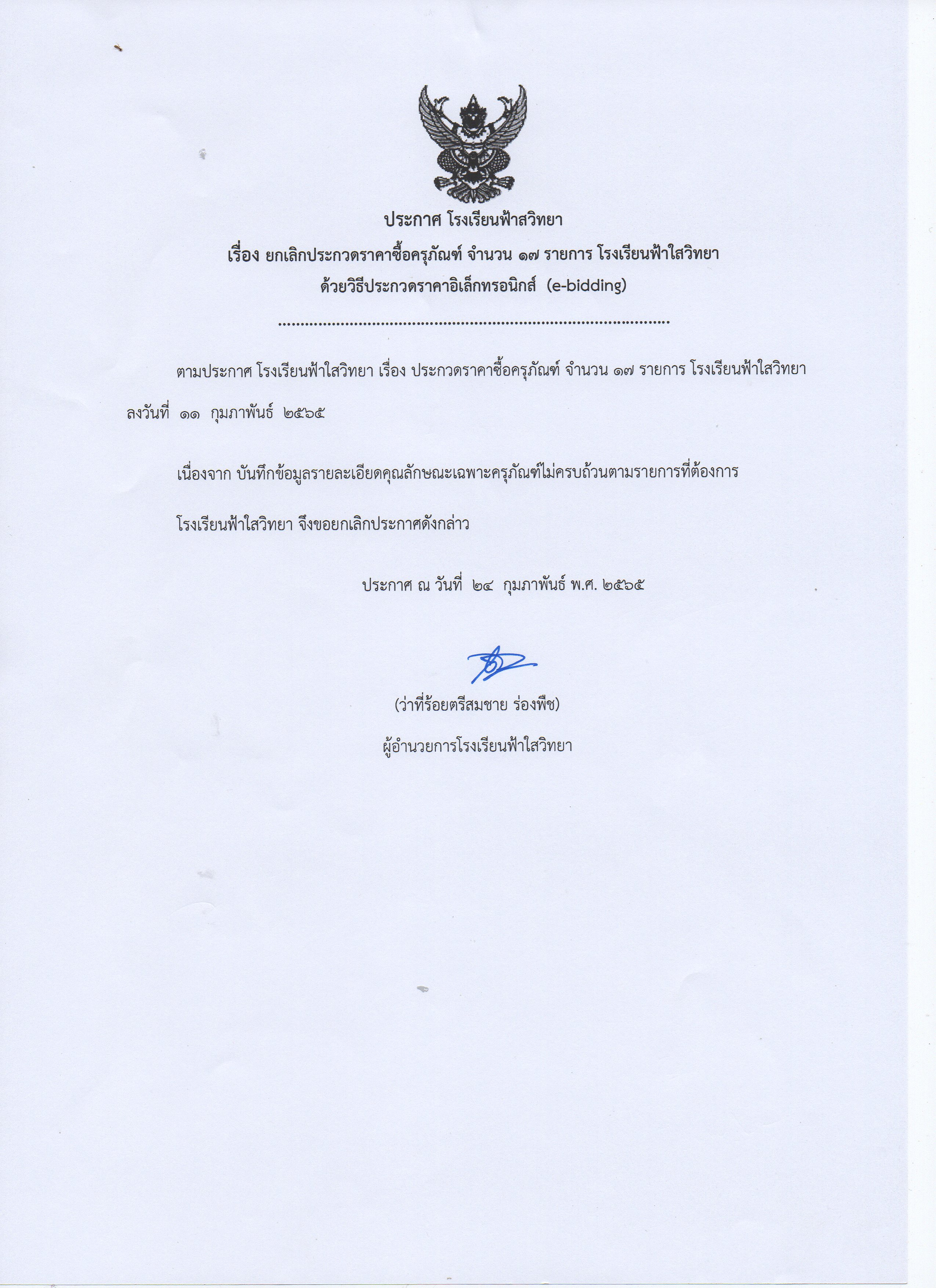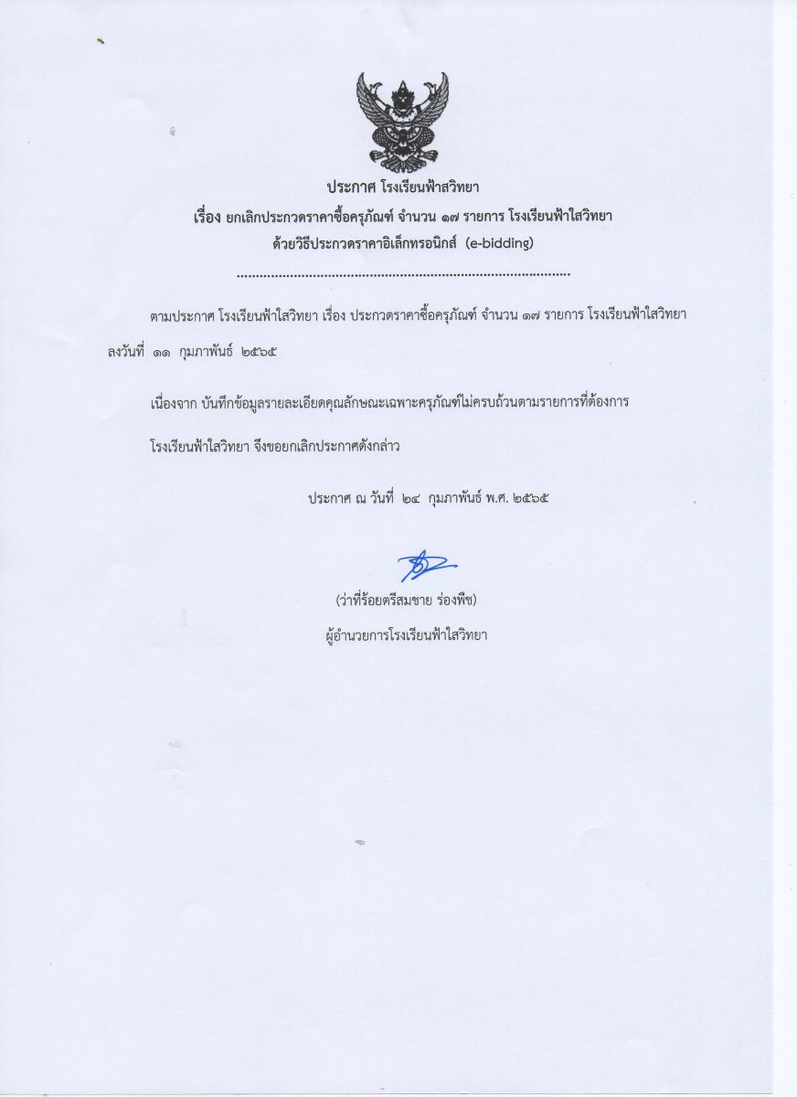 ประกาศโรงเรียนฟ้าใสวิทยา เรื่อง ยกเลิกประกวดราคาซื้อครุภัณฑ์ 17 รายการ ด้วยวิธีประกวดราคาอิเล็กทรอนิกส์