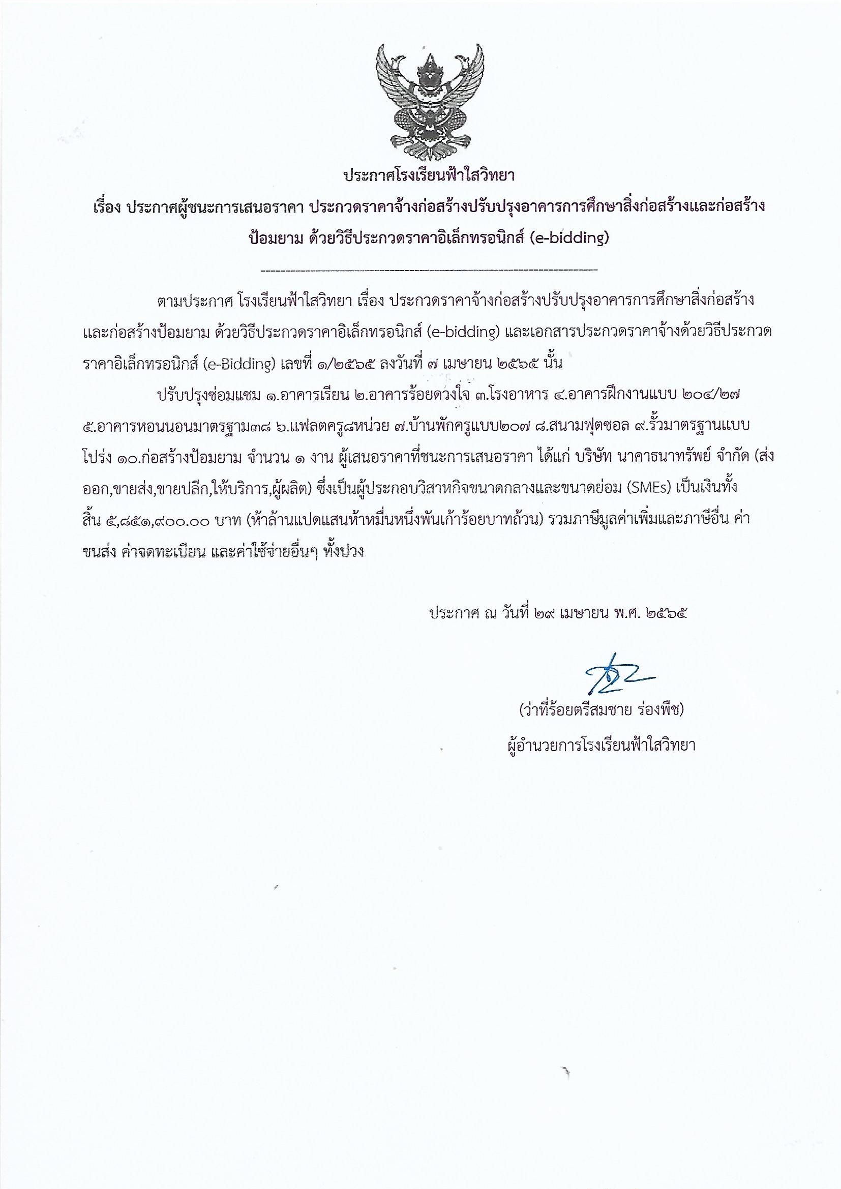 ประกาศโรงเรียนฟ้าใสวิทยา เรื่อง ประกาศผู้ชนะการเสนอราคา ประกวดราคาจ้างก่อสร้างปรับปรุงอาคารการศึกษาสิ่งก่อสร้างและก่อสร้าง ป้อมยาม ด้วยวิธีประกวดราคาอิเล็กทรอนิกส์ (e-bidding)