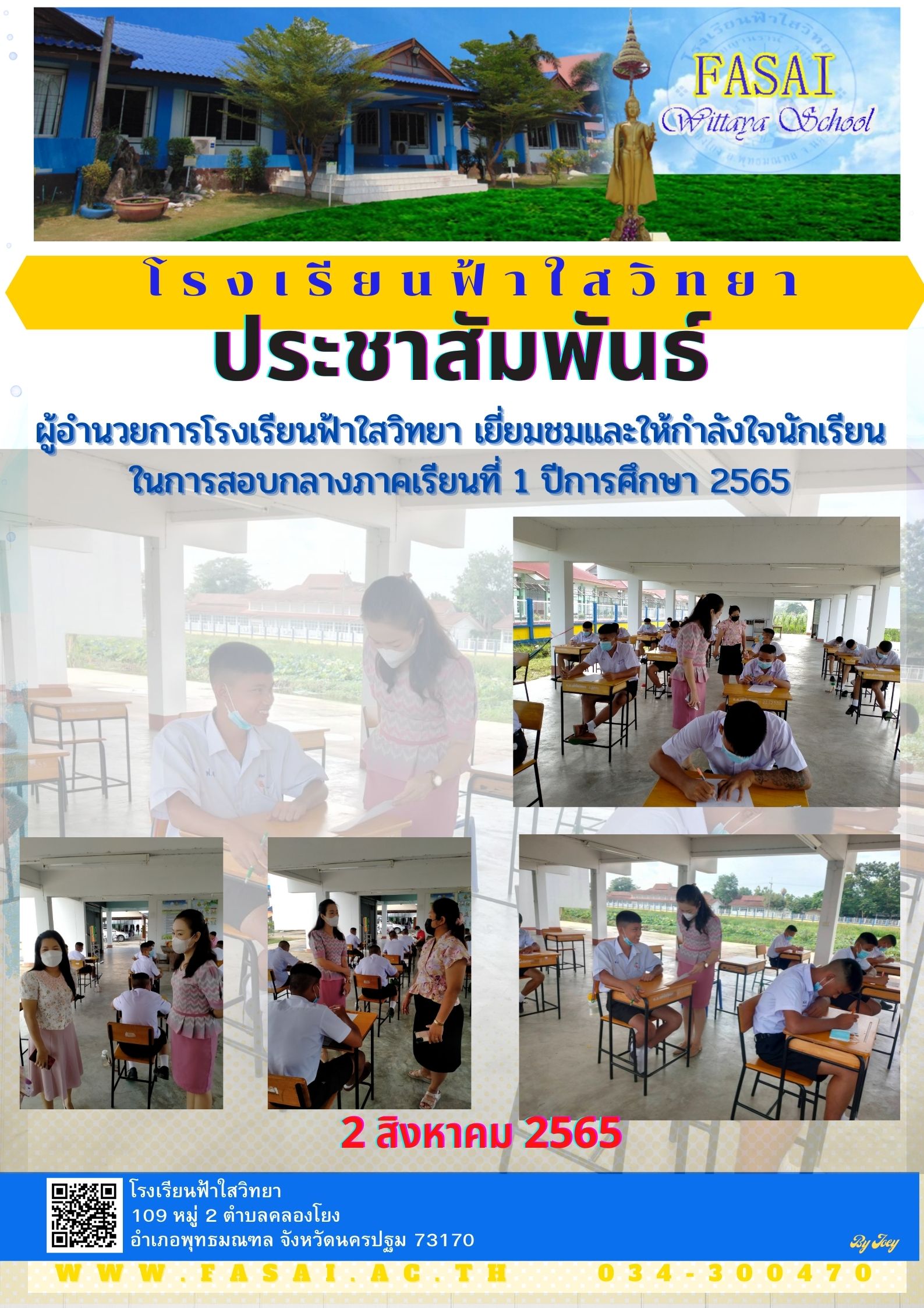 วันที่ 2 สิงหาคม 2565 นางสาววราภรณ์ อารีชินรักษ์ ผู้อำนวยการโรงเรียนฟ้าใสวิทยา เยี่ยมชมและให้กำลังใจนักเรียน ในการสอบกลางภาคเรียนที่ 1 ปีการศึกษา 2565