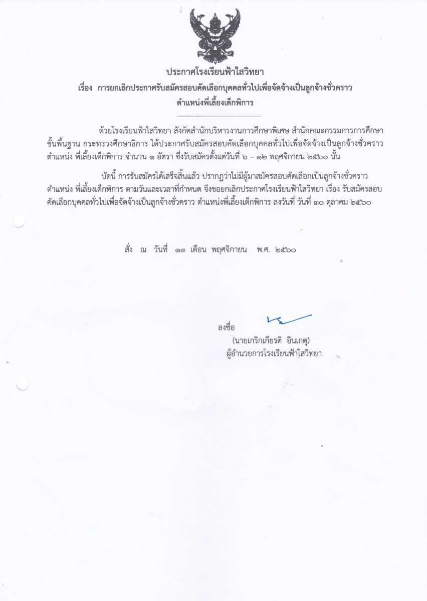 ประกาศโรงเรียนฟ้าใสวิทยา 13 พฤศจิกายน 2560