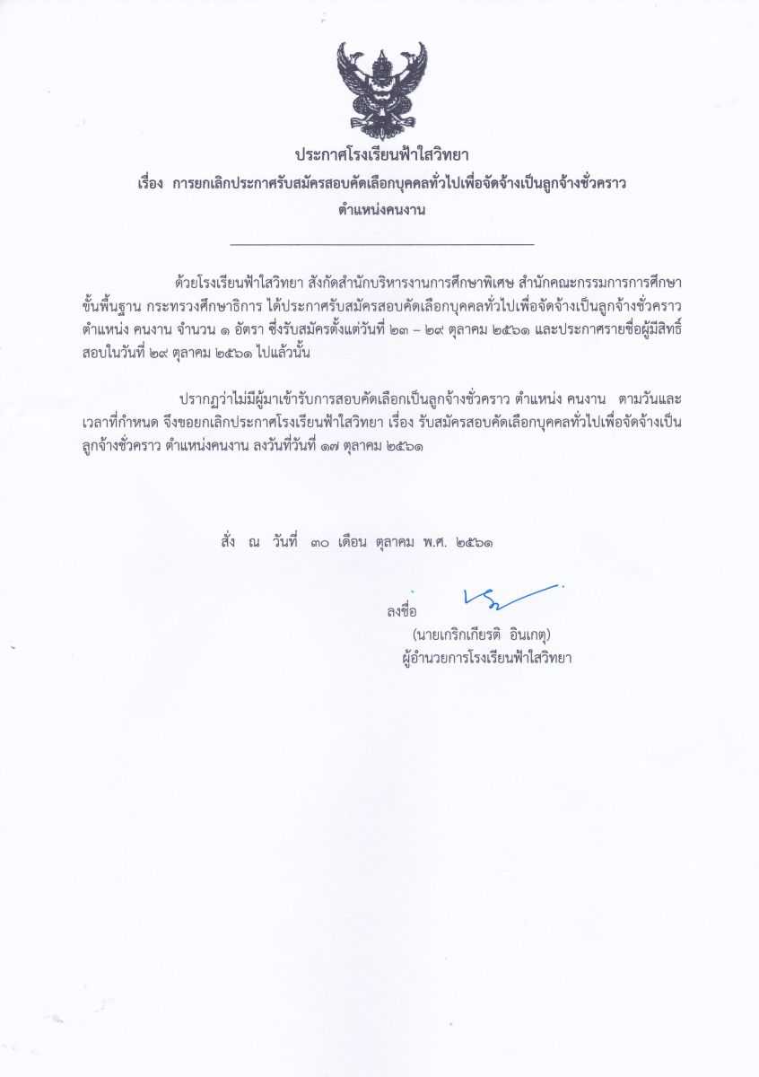 ประกาศโรงเรียนฟ้าใสวิทยา ยกเลิกประกาศวันที่ 17 ตุลาคม 2561