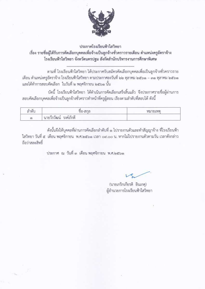 ประกาศโรงเรียนฟ้าใสวิทยา วันที่ 3 พ.ย.61 รายชื่อผู้สอบผ่านการคัดเลือกผู้ปฏิบัติหน้าที่ให้ราชการ ตำแหน่งครูอัตราจ้าง