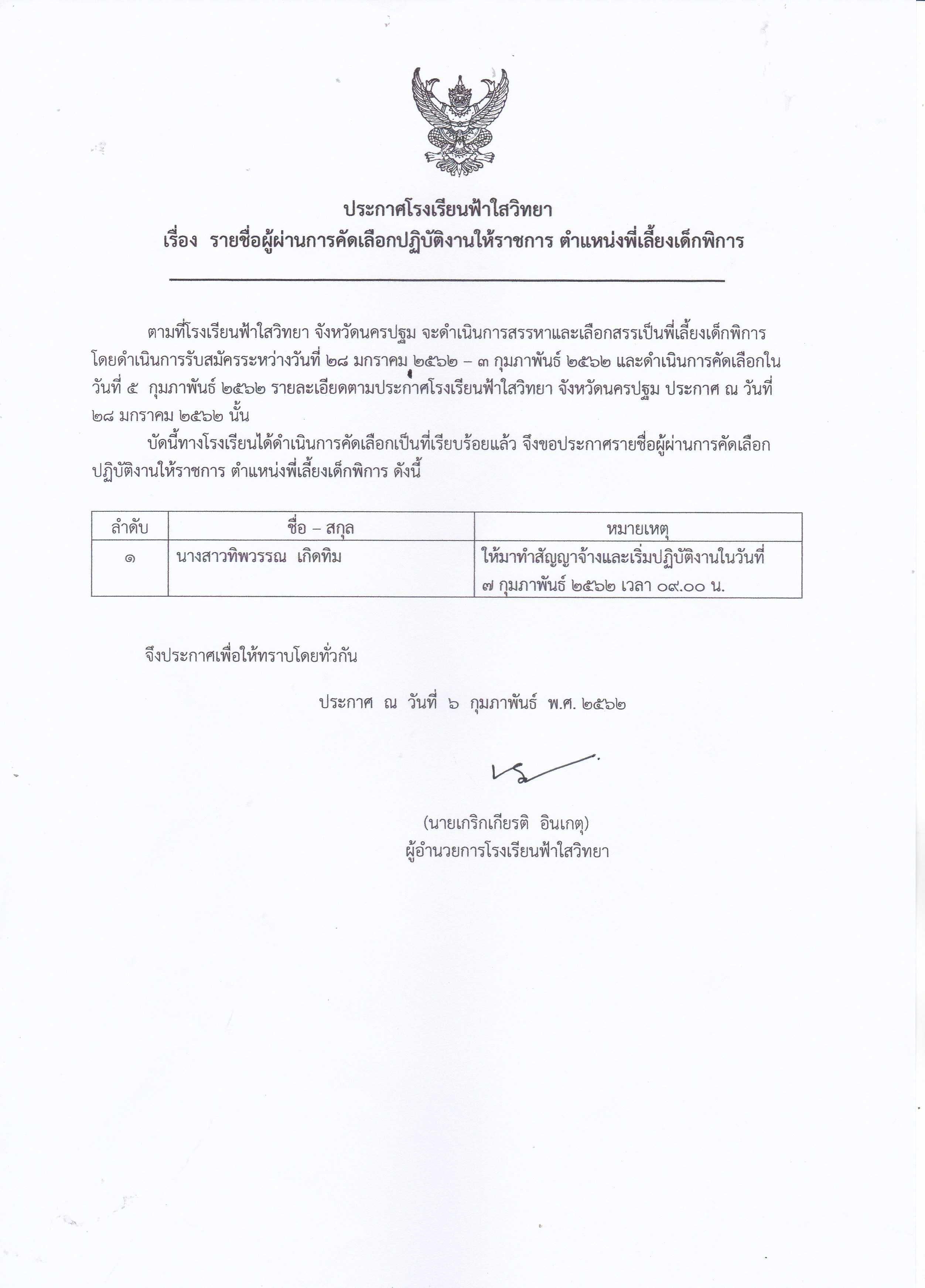 ประกาศผู้ผ่านการคัดเลือก ตำแหน่งพี่เลี้ยง