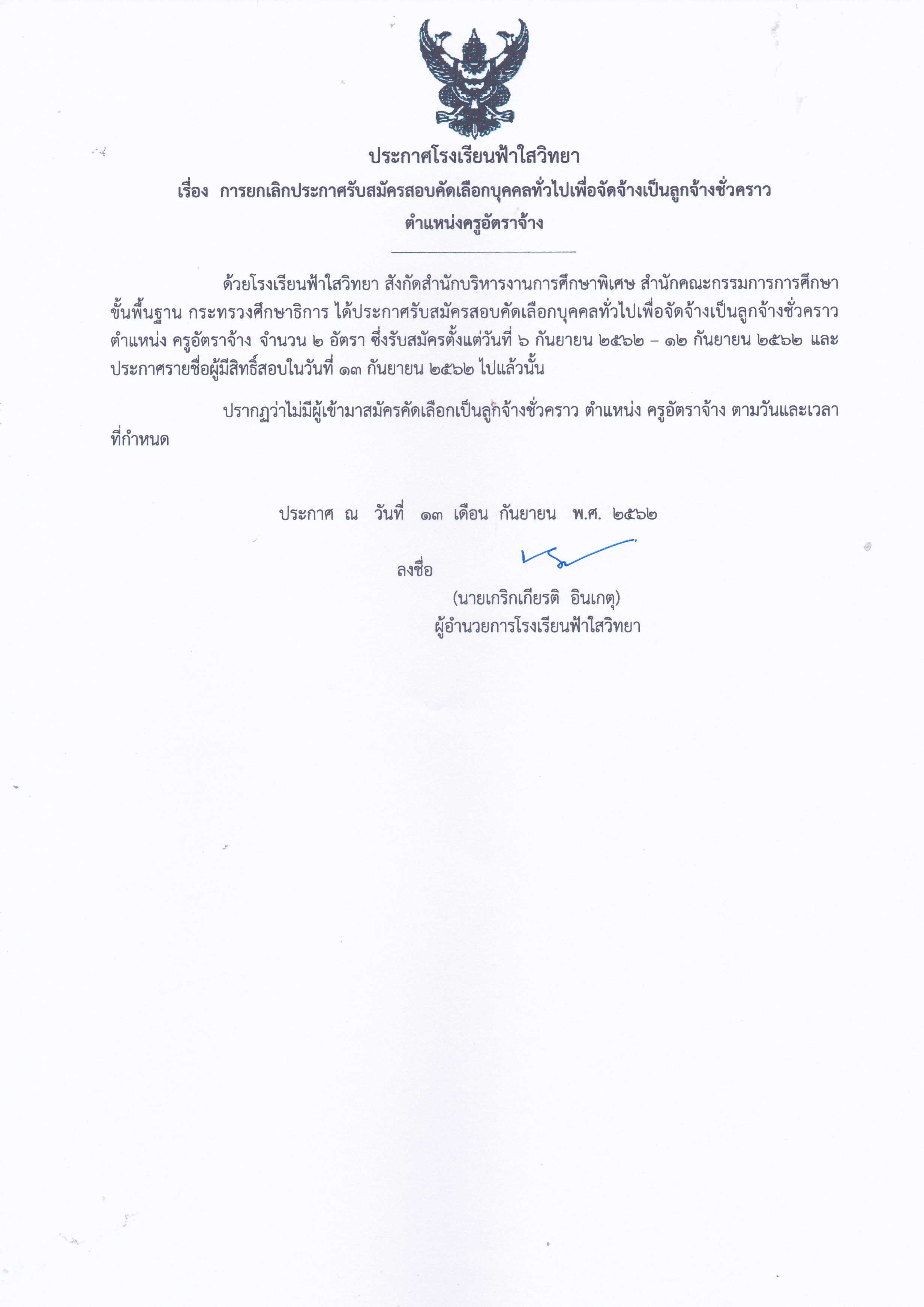 ประกาศโรงเรียนฟ้าใสวิทยา ลงวันที่ 13 กันยายน 2562