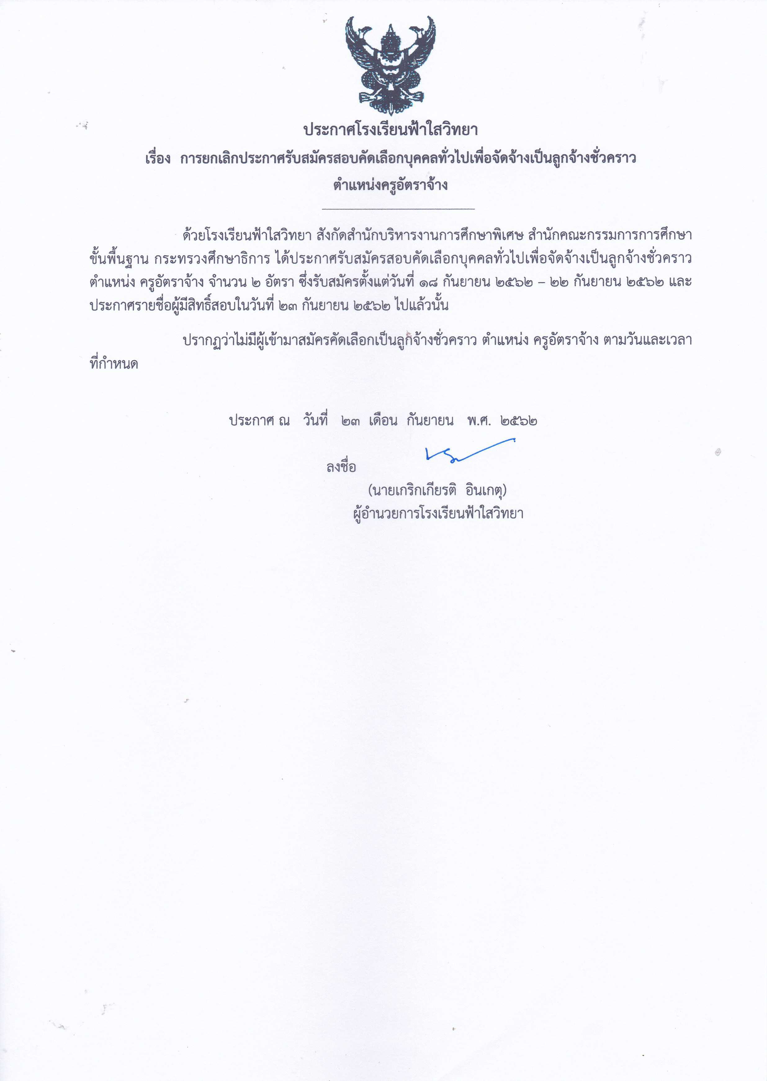 ประกาศโรงเรียนฟ้าใสวิทยา ลงวันที่ 26 กันยายน 2562