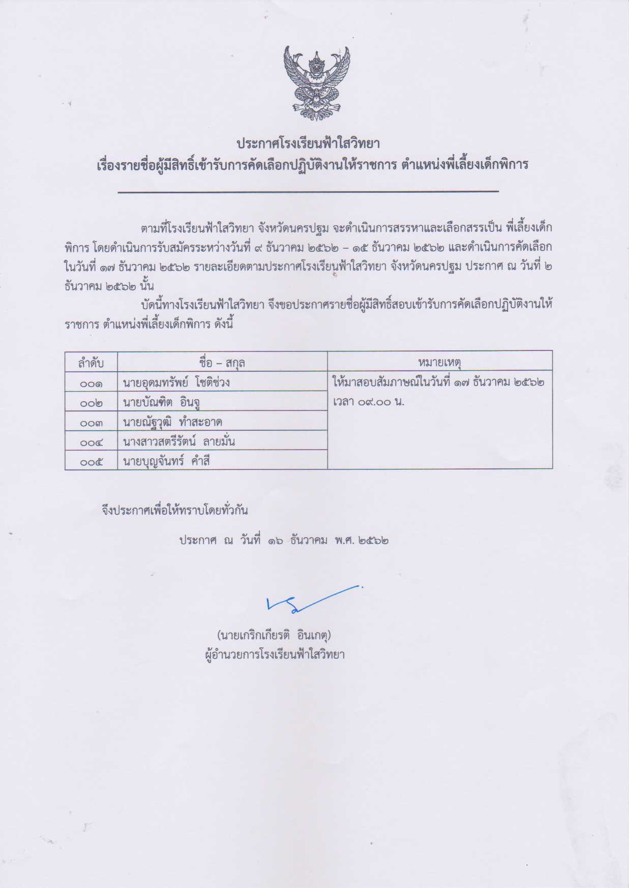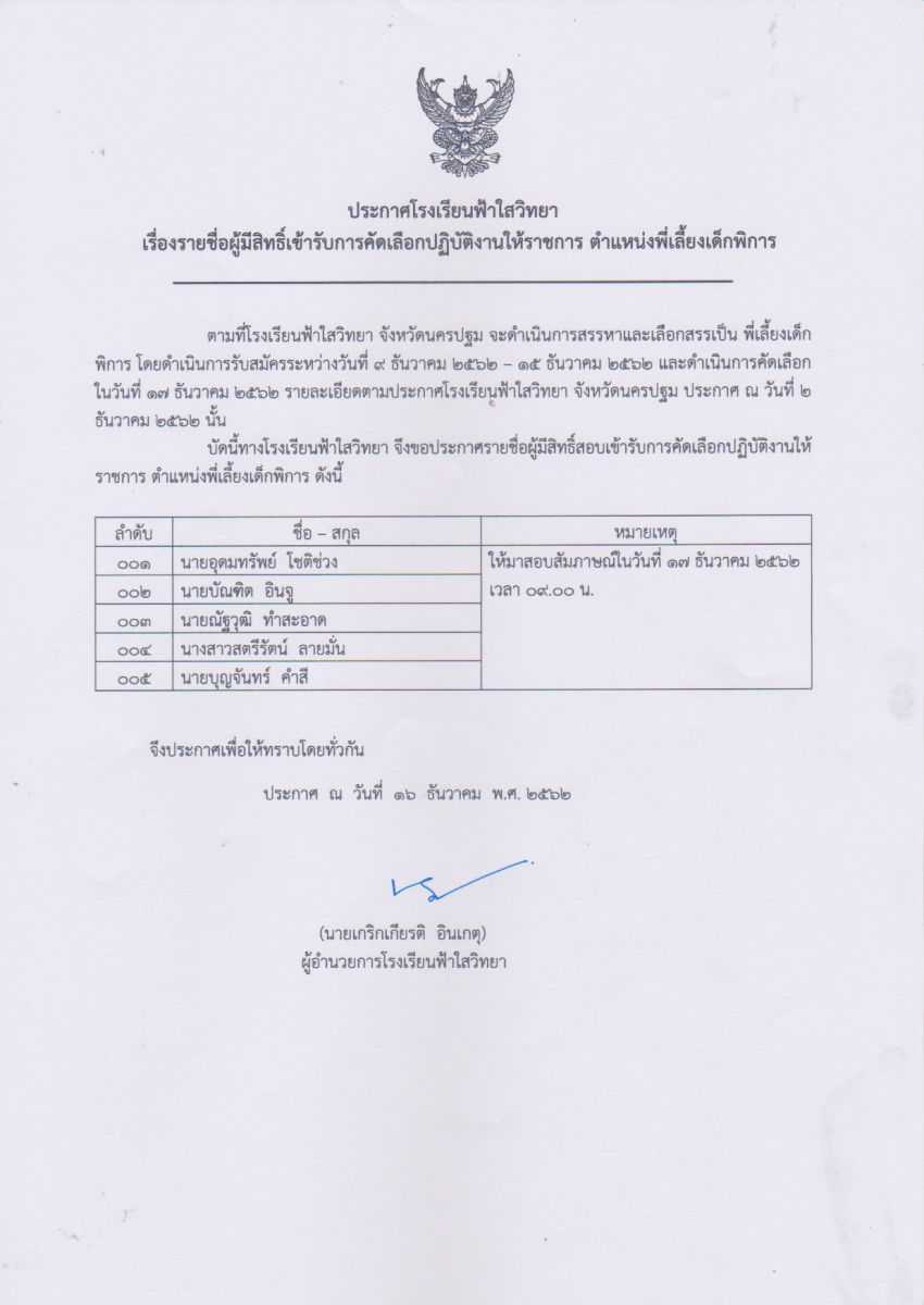 รายชื่อผู้มีสิทธิ์เข้ารับการคัดเลือกปฏิบัติงานให้ราชการ ตำแหน่งพี่เลี้ยงเด็กพิการ