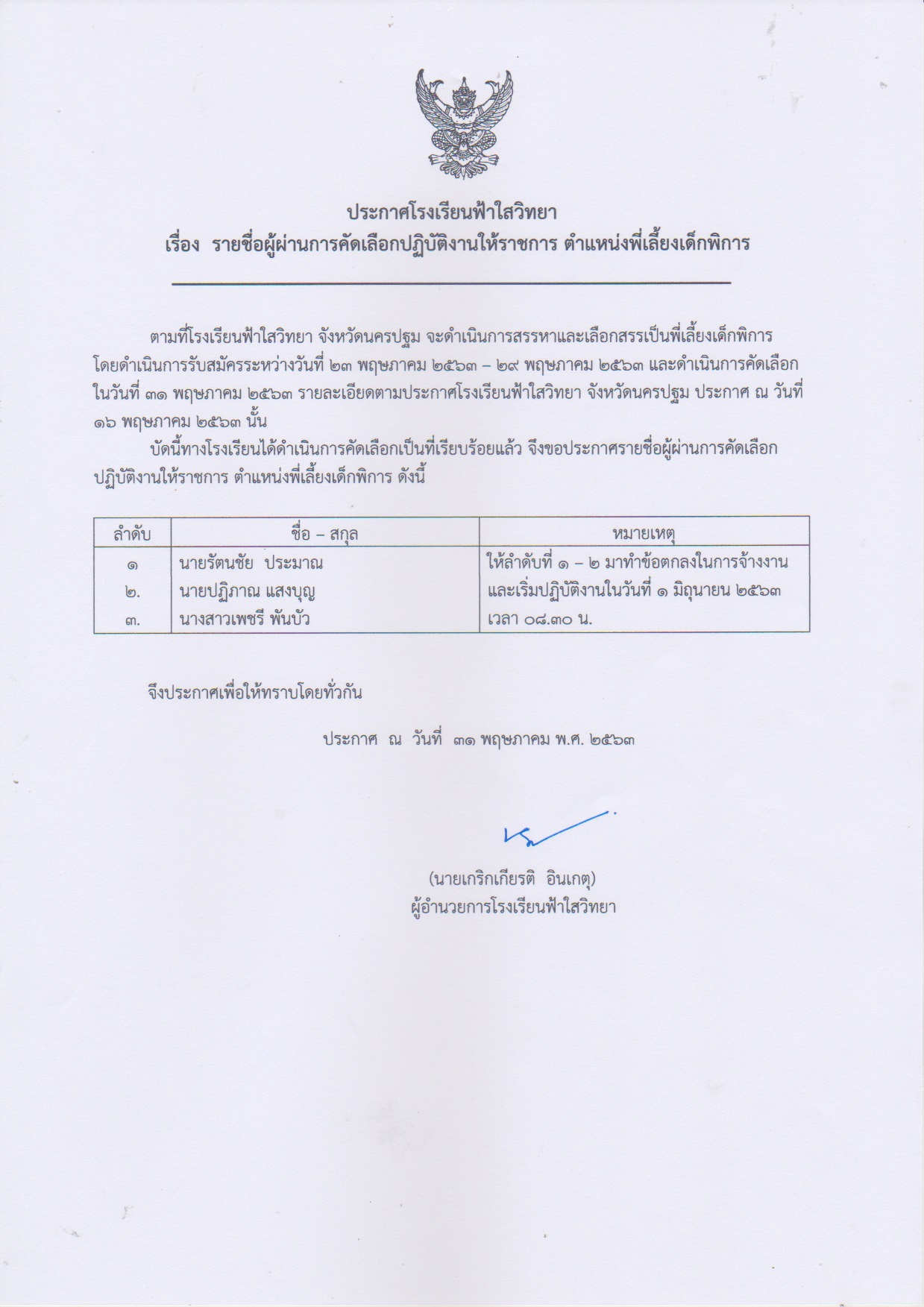 ประกาศรายชื่อผู้ผ่านการคัดเลือกปฏิบัติงานให้ราชการ ตำแหน่งพี่เลี้ยงเด็กพิการ ลงวันที่ 31 พฤษภาคม พ.ศ.2563